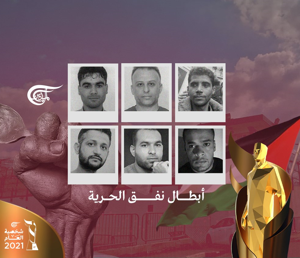 Al-Mayadeen TV eligió a los héroes del Túnel de la Libertad de la prisión de Gilboa, como Personalidad del año 2021, en el camino inspirador hacia la liberación. Esta distinción se otorga por el mérito, la inspiración y la creatividad en aras de la libertad y la voluntad de vivir.