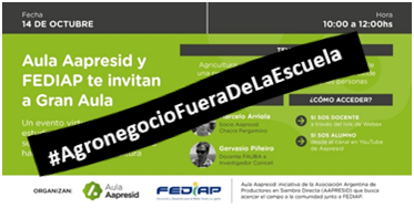 En esta oportunidad, la Asociación Argentina de Productores en Siembra Directa) (AAPRESID) y la Asociación Civil de Escuelas, Bachilleres e Institutos Agrotécnicos, Centros de Formación Rural, Escuelas de la Familia Agrícola e Institutos Superiores; (FEDIAP); convocan a una gran aula virtual a desarrollarse el 14 de octubre, con el objeto de disertar sobre una “agricultura sustentable” basándose en lo que estos actores denominan “Buenas Prácticas Agrícolas” y el desarrollo de tecnologías a fin de potenciar la productividad, sin considerar las externalidades de este modelo: venenos que invaden suelo, aire, agua y los cuerpos; junto al deterioro del ambiente y la concentración de la tierra que genera desarraigo y descampesinización.