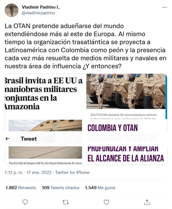 Además, denuncio que la OTAN para hacer realidad su plan de expansión pretende proyectarse en la región latinoamericana utilizando a Colombia como peón.