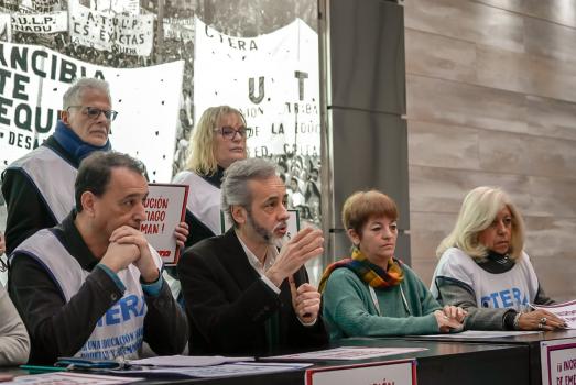 En su sede de Buenos Aires, con la participación del SUTEBA, la Confederación realizó una conferencia de prensa con la presencia de Eduardo López, Secretario Gremial de la CTERA; Jorge Pedro Molina, Secretario de Asuntos Previsionales de la CTERA; María Laura Torre, Secretaria General Adjunta del SUTEBA; y Angélica Graciano, Secretaria General de UTE.