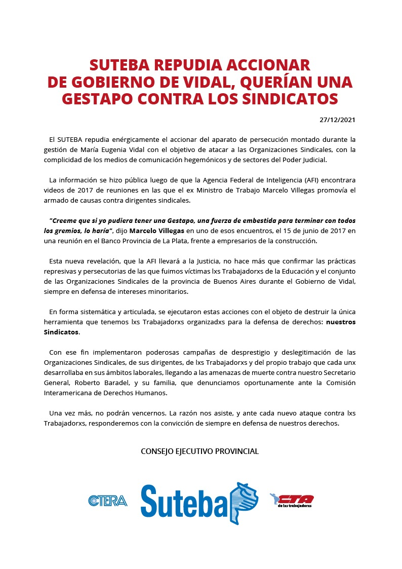 Esta nueva revelación, que la AFI llevará a la Justicia, no hace más que confirmar las prácticas represivas y persecutorias de las que fuimos víctimas las y los Trabajadores de la Educación y el conjunto de las organizaciones sindicales de la provincia de Buenos Aires durante el gobierno de Vidal, siempre en defensa de intereses minoritarios.