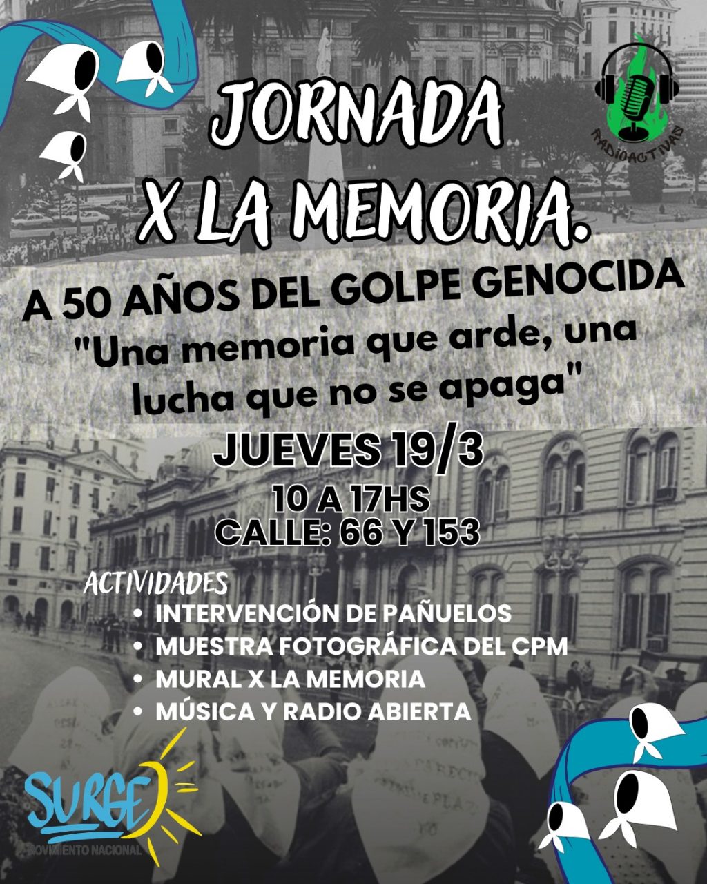 Bajo la consigna «Una memoria que arde, una lucha que no se apaga», a 50 años del Golpe Genocida, este jueves 19 de marzo de 10 a 17hs, en 66 y 153; se realizará la Jornada x la Memoria,, que impulsa Movimiento Surge.