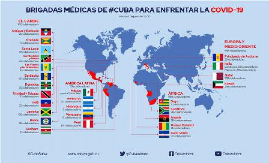 Recientemente, el canciller de Cuba, Bruno Rodríguez, recordó la contribución de la isla al enfrentamiento de la Covid-19 en todos los continentes, y afirmó que estos grupos, sumados a la colaboración en materia de salud existente en 59 naciones, permiten extender la solidaridad y salvar vidas.