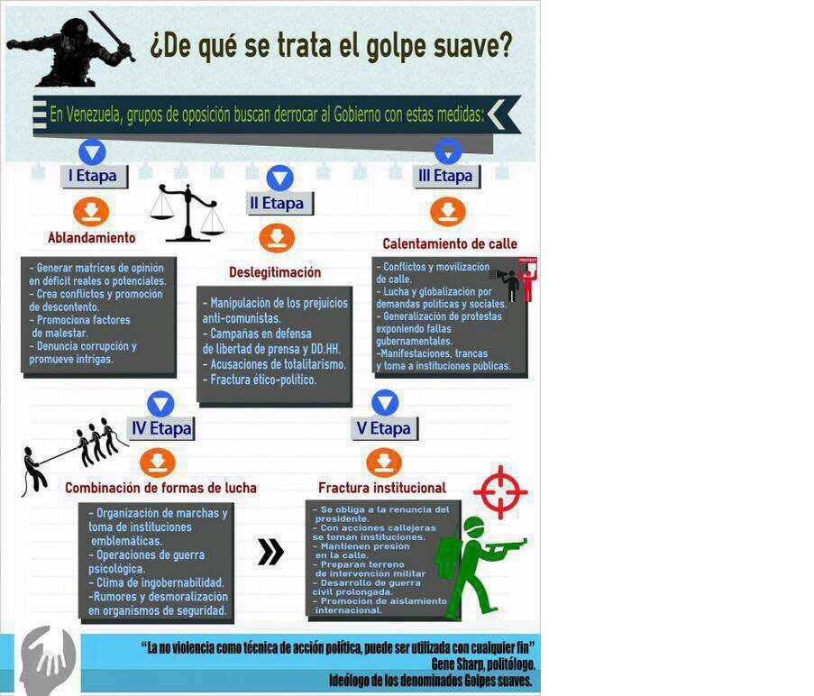 El comunicador asimismo sostuvo que “el golpe de estado blando se utiliza como alternativa al golpe de estado militar, muy utilizado hasta la década del noventa, pero sustituido por otras técnicas desde esa década debido a que ha perdido prestigio”. Y añadió que de acuerdo con Sharp, “la estrategia del golpe suave puede ejecutarse a través de cinco etapas jerarquizadas o realizadas de manera simultánea”.