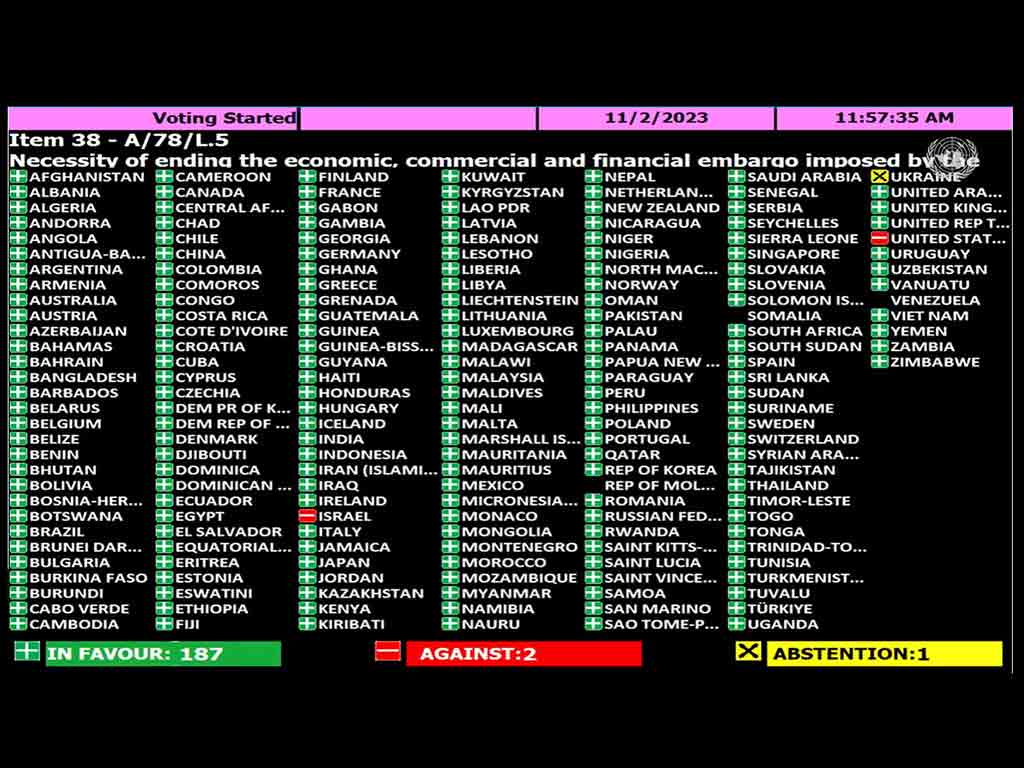La Asamblea General de la Organización de las Naciones Unidas (ONU), por tres décadas continuas, condenó nuevamente el criminal bloqueo de más de seis decenios contra la sufrida Cuba.