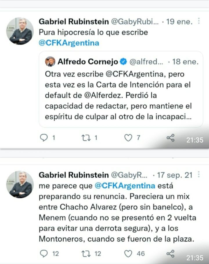 «La corrupción es un tema endémico, que tuvo un salto muy alto con Menem y uno aún mucho más alto con Néstor y Cristina. Y si hubo/hay corrupción con Macri o Larreta (no me consta pero no la descarto) no hay que dejarlo pasar», dice otra de sus publicaciones, en diciembre de 2021.