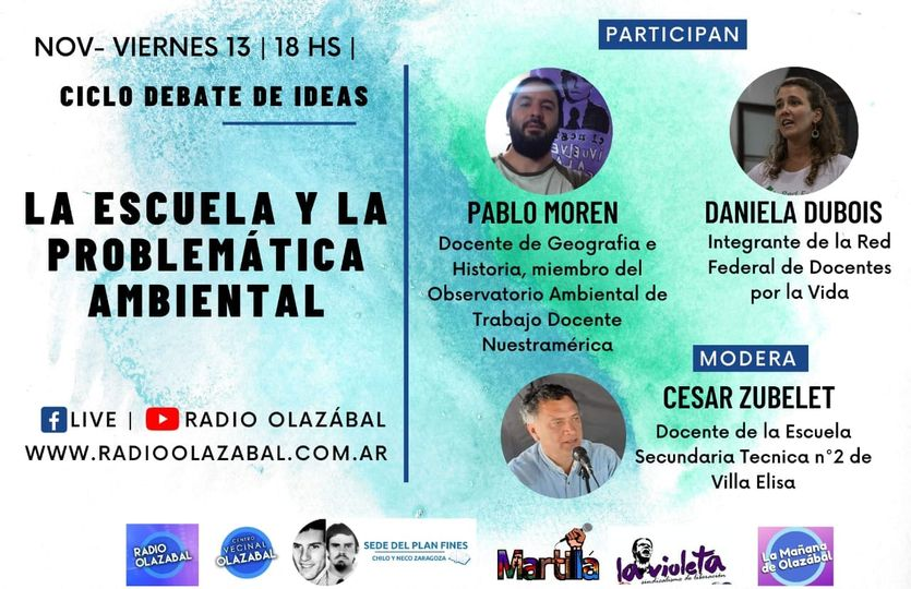 El viernes 13 de noviembre, con la participación de Daniela Dubois de la Red Federal de Docentes por la Vida, y del profesor de Geografía e Historia Pablo Moren del Observatorio Ambiental de Trabajo Docente Nuestramerica; se realizó la tercera jornada del Ciclo Debate de Ideas, dedicada en esta oportunidad a la temática de Educación y Problemática Ambiental.