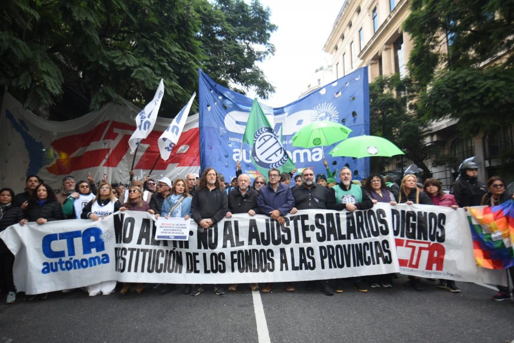 Roberto Baradel expresó: Estamos acá para decirle al gobierno nacional que cuanto más ataquen a los trabajadores, más nos van a encontrar en la calle defendiendo los derechos de todas y todos. Rechazamos el decreto que elimina la responsabilidad del Estado Nacional en la Paritaria Nacional Docente y cercena el derecho a huelga de todos los trabajadores. No lo vamos a aceptar. Repudiamos también la represión a los jubilados y el ajuste. Por eso, en unidad, miles de docentes en todo el país, con la CTA de los Trabajadores, la CTA Autónoma, docentes universitarios, ATE, AJB, CICOP, Frente Barrial, organizaciones sociales y de derechos humanos, nos movilizamos y seguiremos luchando para defender los derechos de los trabajadores y nuestras organizaciones sindicales.